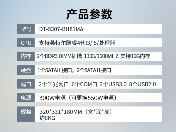 FUN88工控DT-5307-BH81MA是一款壁挂式工控机,采用酷睿4代13/15/17处理器,内存2个DDR3,支持16G。300W额定电源。单面出线,支持7个扩展槽,2个千兆网口,6个COM口,支持多种操作系统,欢迎定制。